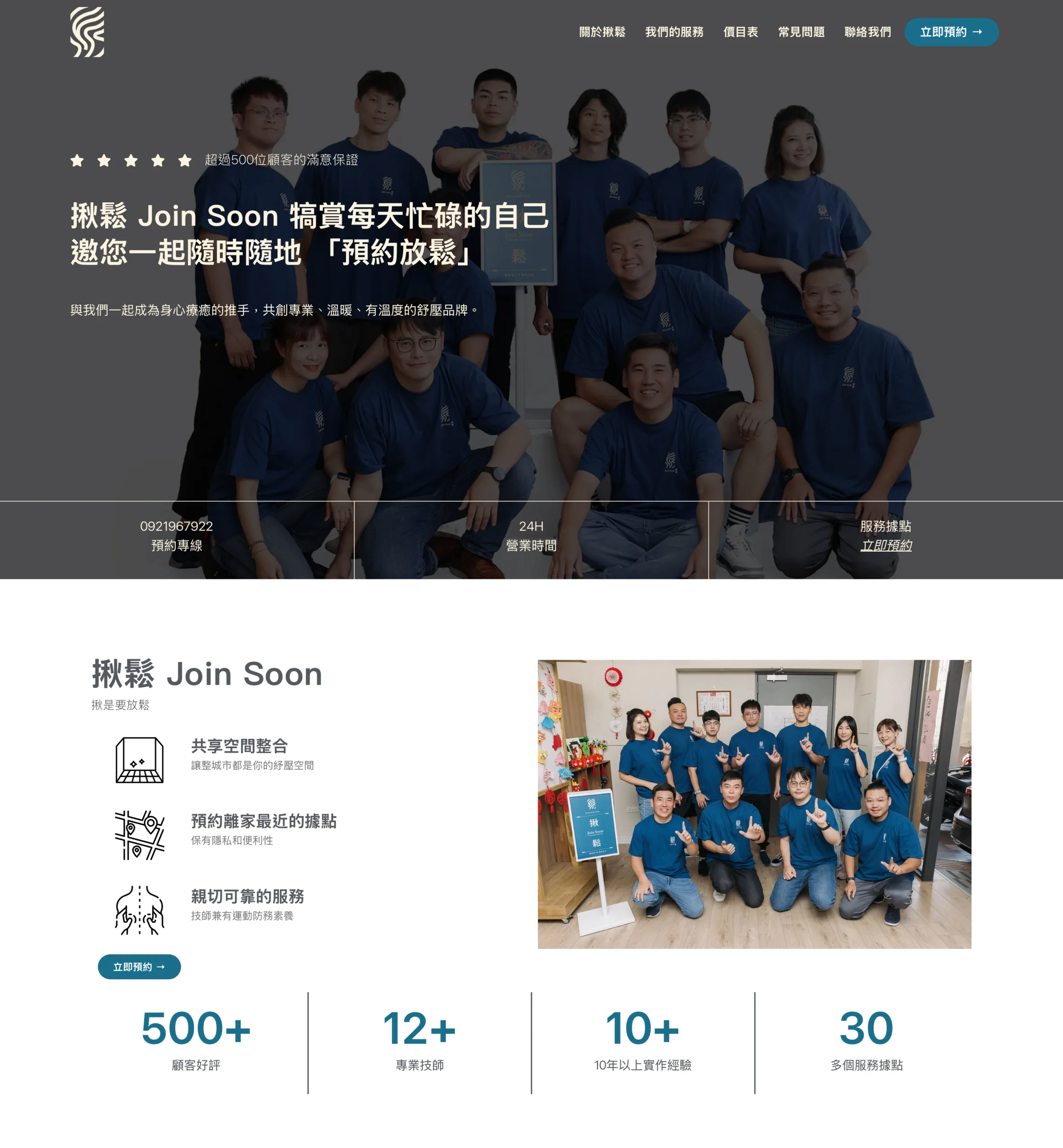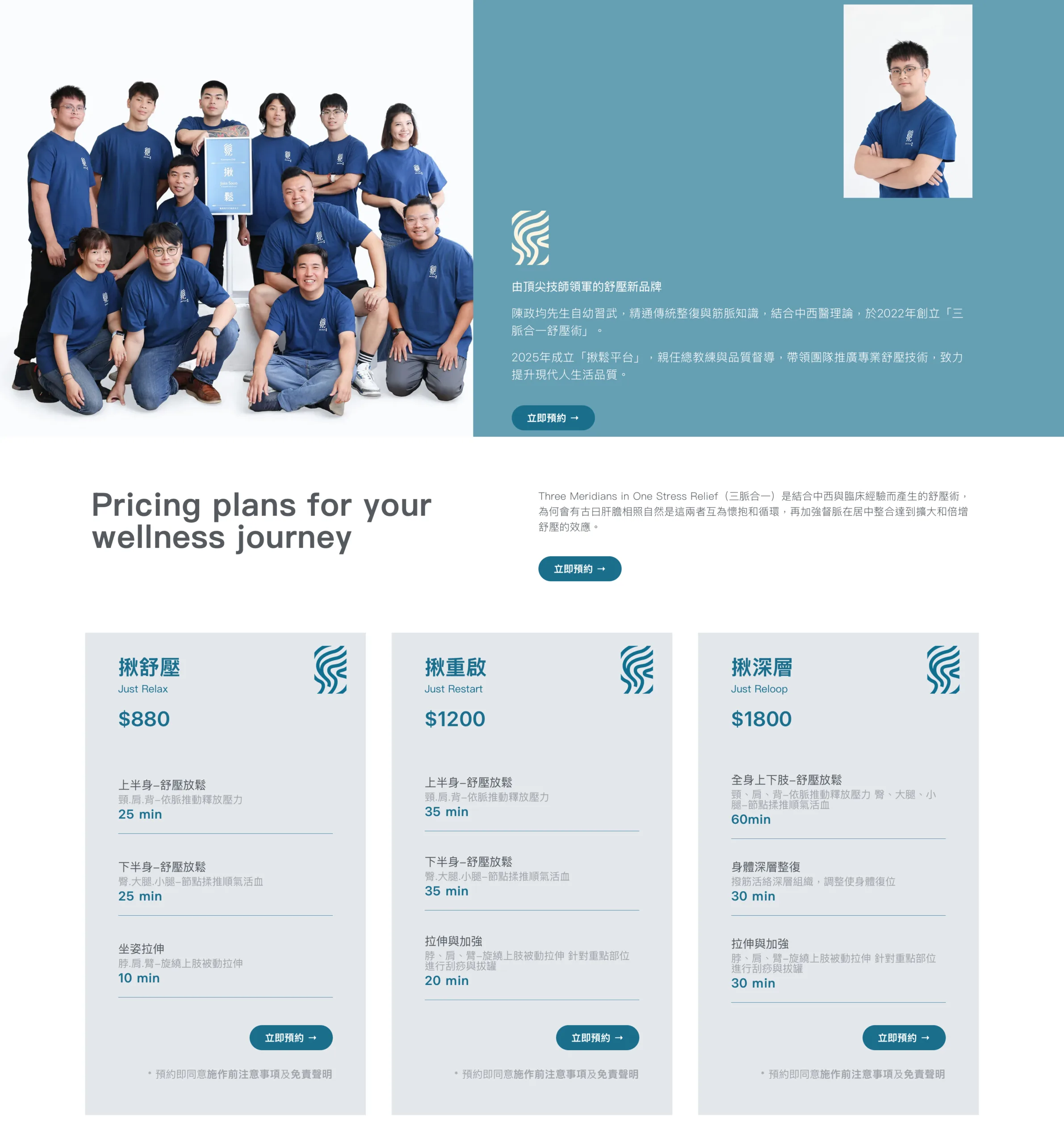 揪鬆以「共享空間整合」為核心,讓整座城市成為你的紓壓空間,結合專業療癒與便利預約, 兼顧隱私與便利。親切可靠的技師團隊,以專業與溫度,陪你找回身心的節奏。